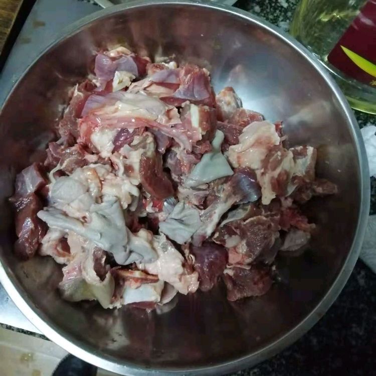1、买回来的新鲜羊肉洗干净剁好合适大小的块。