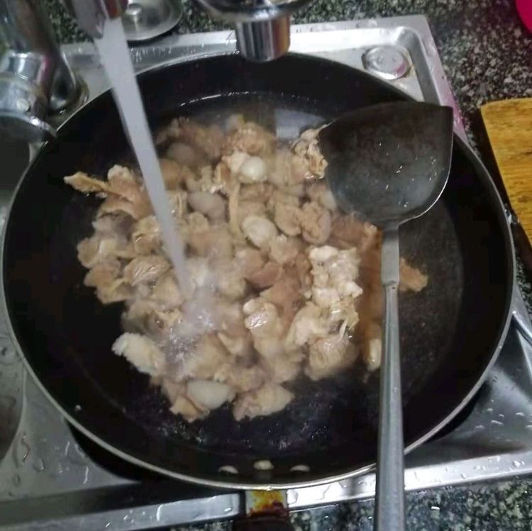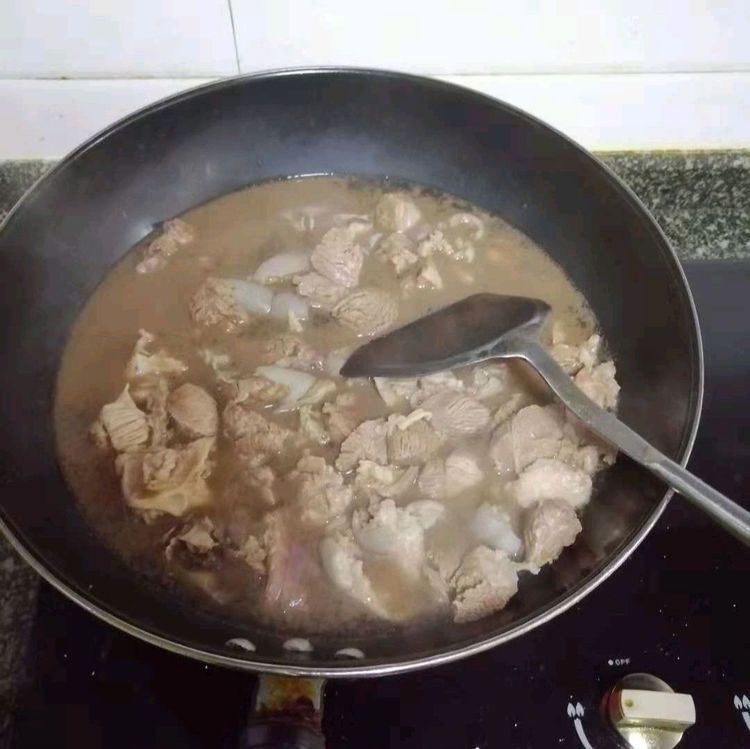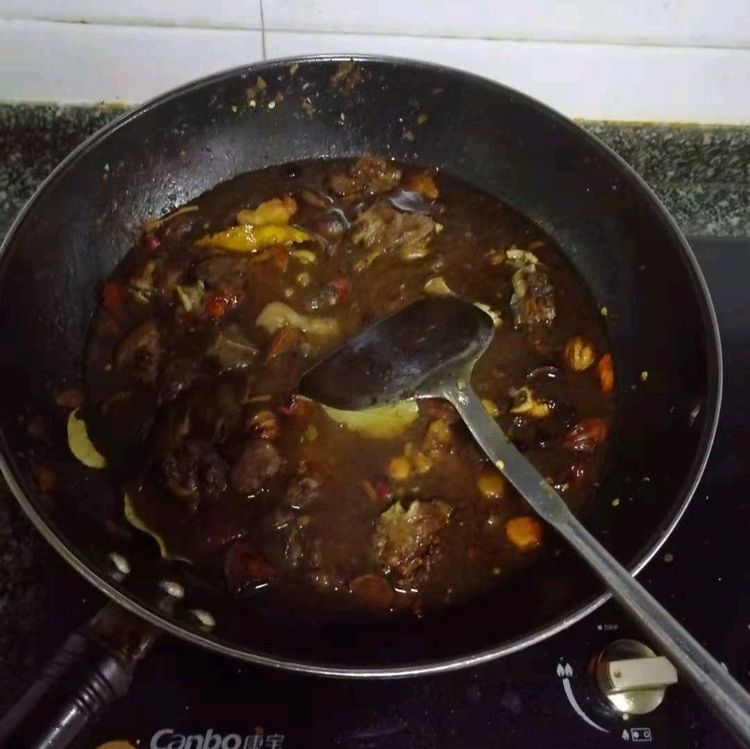 8、羊肉煸炒干香有点偏焦的感觉就可以放调料了,放盐、鸡精、生抽、耗油、红烧酱油,翻炒均匀后倒半只啤酒,然后放水没过羊肉,烧开焖煮。