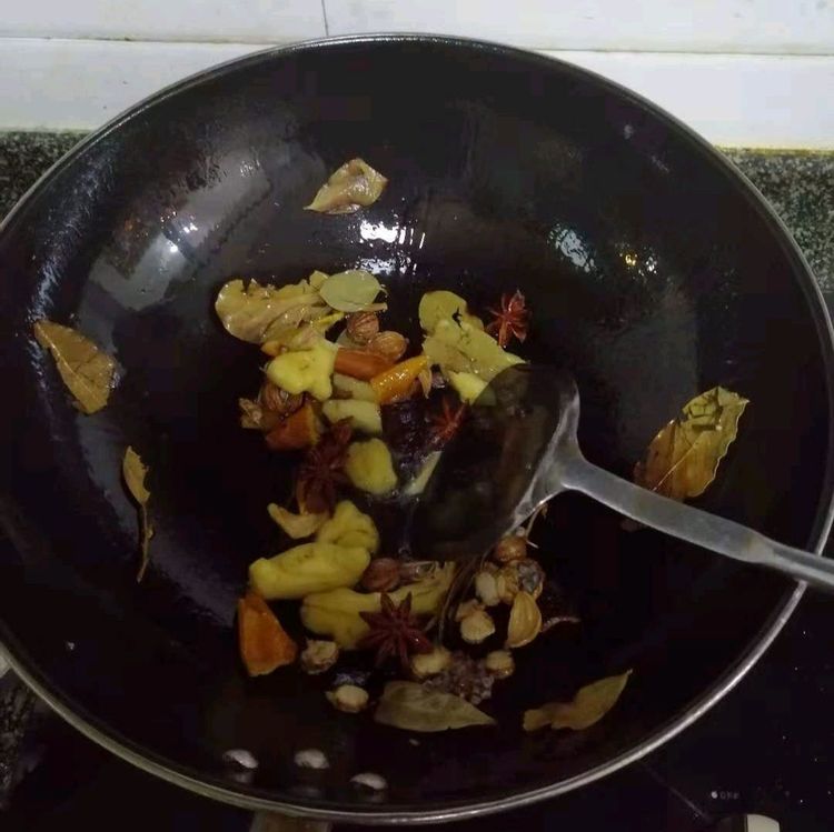 5、锅内烧油,油烧热后将老姜、大蒜子、陈皮、桂皮、草果、香叶倒入锅内翻炒。