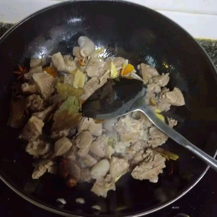 6、香料炒制干香后下入羊肉煸炒,煸炒一会后放适量白酒,继续翻炒。