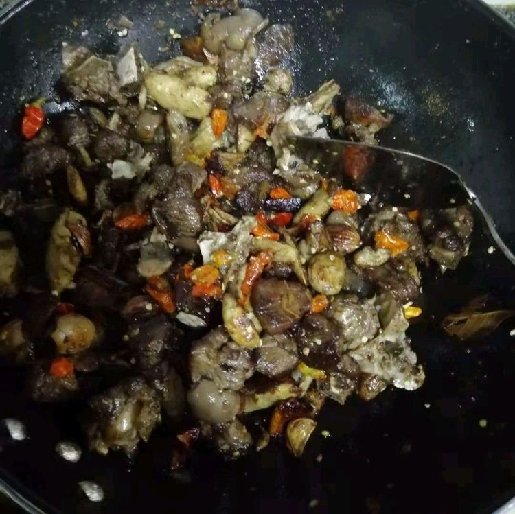 7、羊肉煸炒到干香,羊肉油脂吱吱吱的响声后,放入干小米椒,继续翻炒。