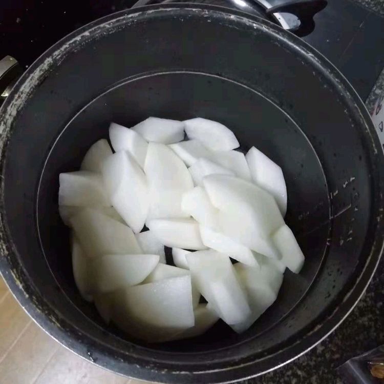 9、盖上锅盖烧开后,放入白萝卜中火焖煮直至羊肉酥烂,这样时间就比较久,或者用高压锅焖煮时间会更快。