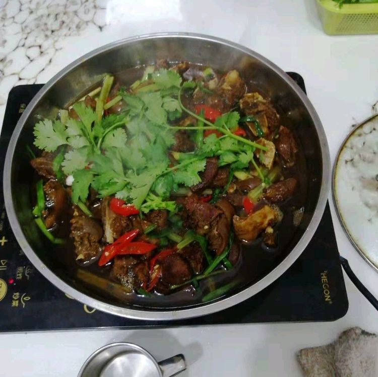 11、在羊肉没出锅前准备好火锅,底部放大蒜节、焖煮好的萝卜、香菜、羊肉汤,然后将羊肉盖在上面,在羊肉上放上几根香菜点缀又增香。