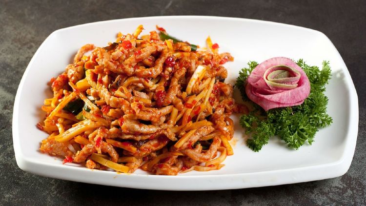 虽然名叫鱼香肉丝,但原料里并没有鱼,鱼香只是川菜的传统味型之一。吃菜主料是猪肉,辅料是泡椒,才能炒出鱼香味。选用肥三瘦七肉丝,泡辣椒末,食盐,味精,白糖,姜末,蒜末,食醋,香油,色拉油,水淀粉,并配以冬竹笋丝,黑木耳丝进行烹调,口感软滑,配料脆嫩,色泽红润,咸甜酸辣兼顾,葱姜蒜味浓郁。