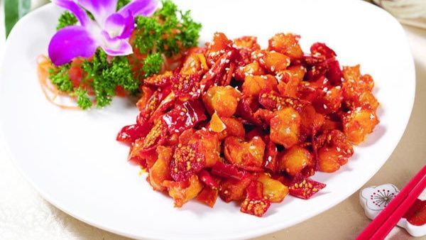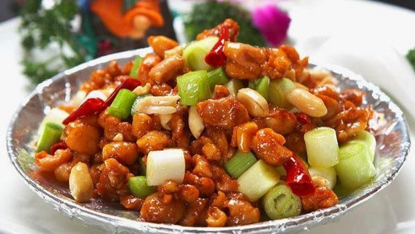 又一道驰名中外的名菜。选用鸡肉为主料,佐以花生米、黄瓜、辣椒等辅料烹制而成。辣中有甜,甜中有辣,鸡肉的鲜嫩配合花生的香脆,入口鲜辣酥香,红而不辣,辣而不猛,肉质滑脆。