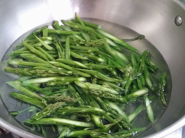 4、煮锅加水烧开,芦笋入锅焯水后捞出沥干水。