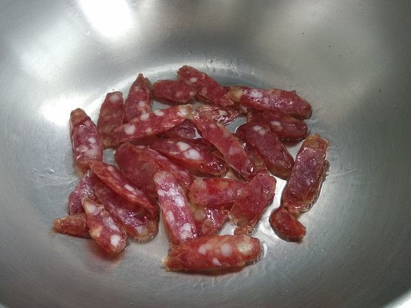 5、锅烧热,加少许油,香肠入锅煸炒。