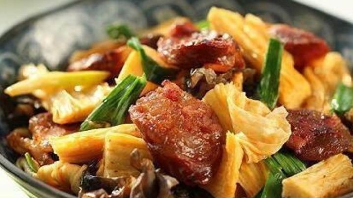 3、热锅凉油,将腊肠放入里面煸炒,煸炒出香味后加入焯过腐竹和木耳进去翻炒。