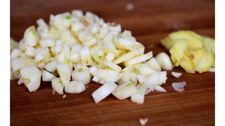 4、把蒜和姜切成沫备用,不要切得太碎,中等个头就可以了。