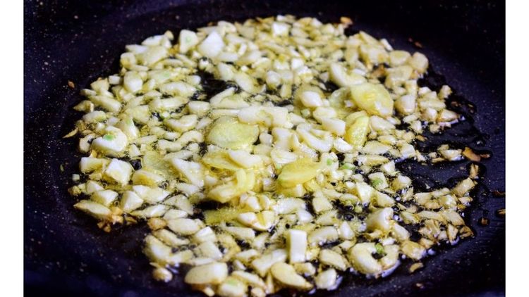 5、锅里放少量油烧热,就关火。再下入蒜沫和姜沫,因为关火了,油温会迅速下降,这样的蒜和姜就不容易烧焦,香气也容易出来。